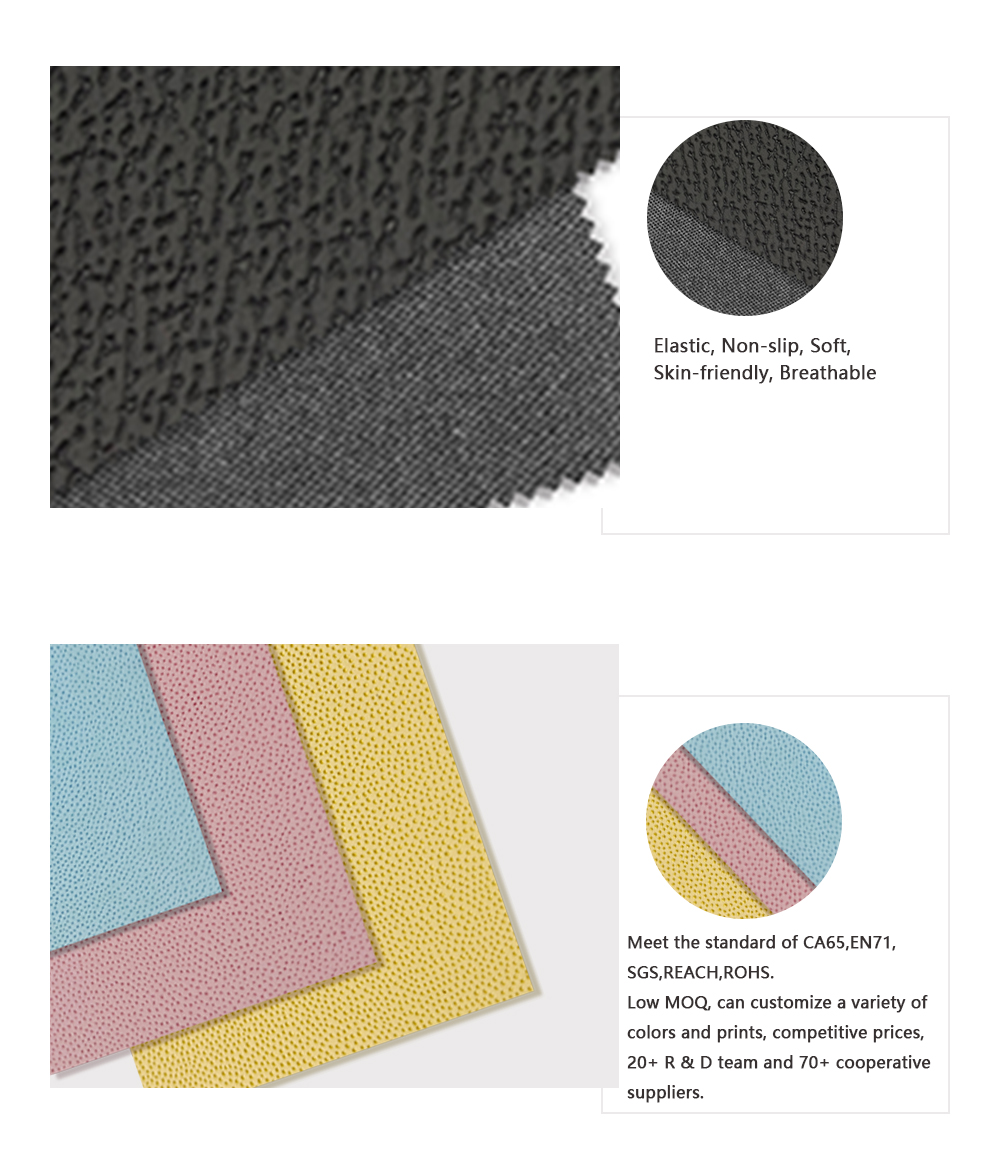 → No base fabric, thickness:0.35—0.55mm, Width: 152cm → Elastic, Non-slip, Soft, Skin-friendly, Breathable. → Meet the standard of CA65,EN71,SGS,REACH,ROHS. → Low MOQ, can customize a variety of colors and prints, competitive prices.